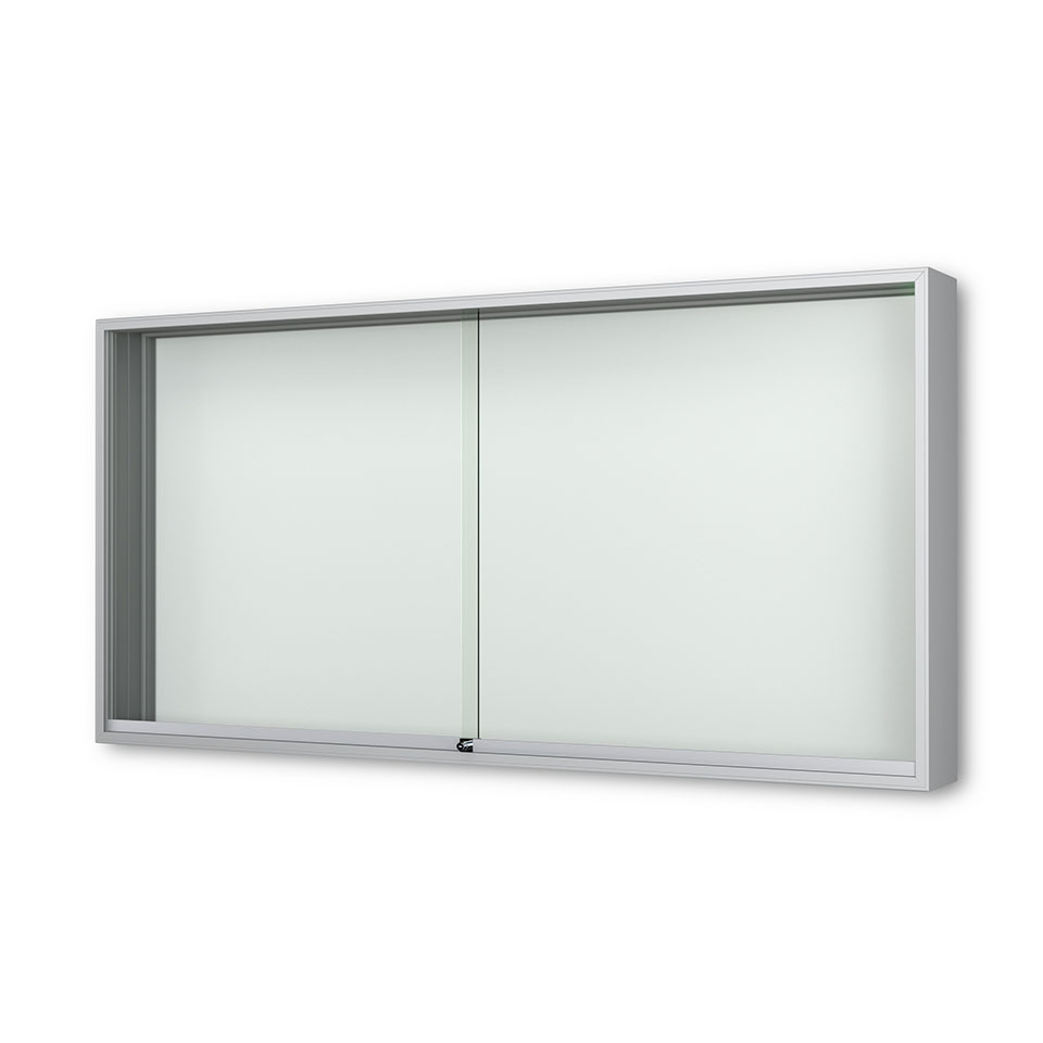 Schaukasten Fortis - eckig - mit Schiebetüren -210 mm Gehäusetiefe, rollengelagerte Schiebetüren, höchster Brandschutz (A1) Größe - 8 × DIN A4 • 930 × 695 mm Öffnung - rollengelagerte SchiebetürenVerglasung - Einscheiben-Sicherheitsglas / ESGOberfläche - Eloxierung in matt-silber (E6/EV1)Beleuchtung - ohne BeleuchtungSchließung - Sicherheitsschlösser mit je 2 SchlüsselnRückwand - weiße, magnethaftende Rückwand inkl. 10 Magnete